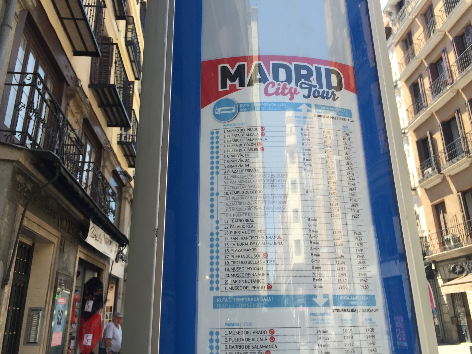 走到City Bus站牌,看了一下路線圖,普拉多Prado一定是重要景點啊~馬德里的City Bus有紅色跟綠色兩家公司經營,紅色的路線比較齊全,車子也多。紅色還有分1線、2線,21歐元可以搭一天/人,二天25歐元/人,因為接下來都要看景點,我們決定搭車代步二天啦!