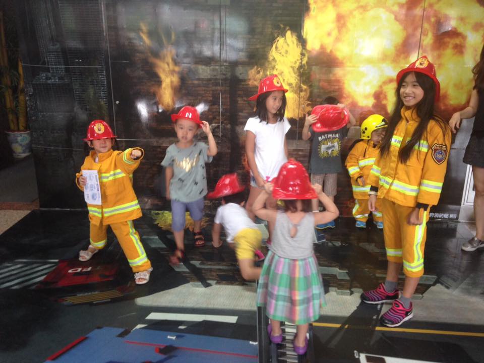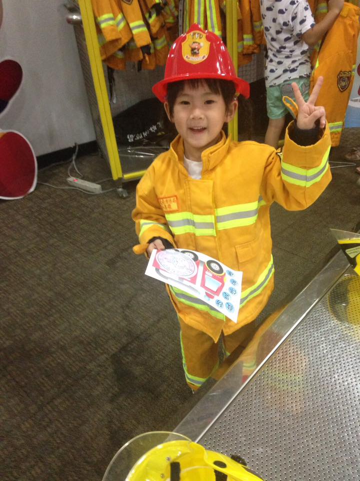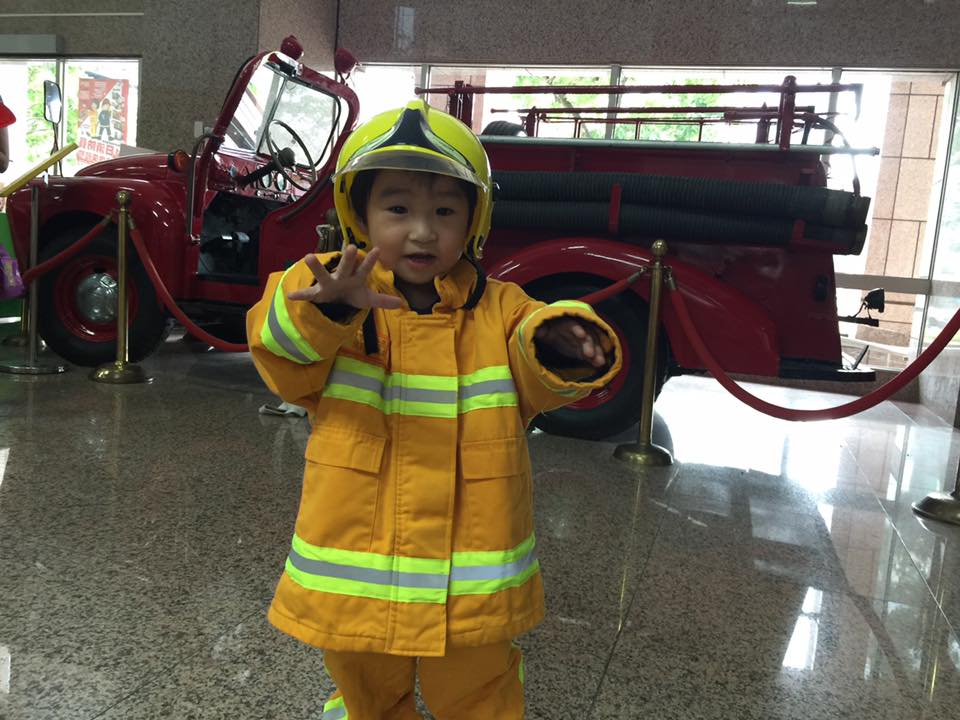| 參訪完畢來到一樓小朋友可以換上整套消防衣拍照,還有兩種色系喔,簡直就是Baby Boss麻,頭上的帽子可以帶回家 |