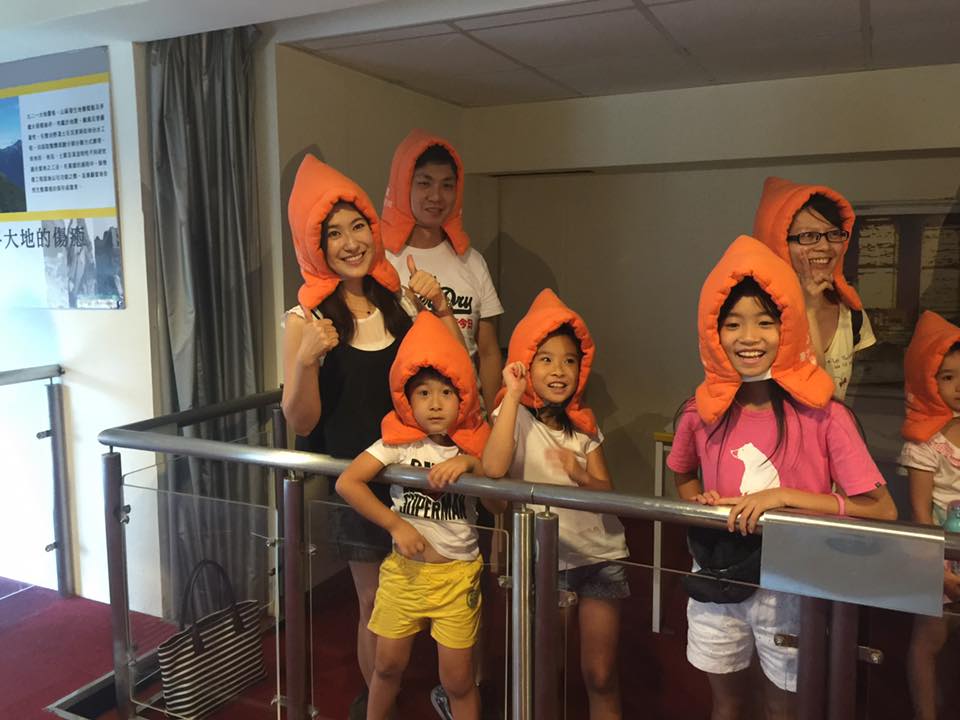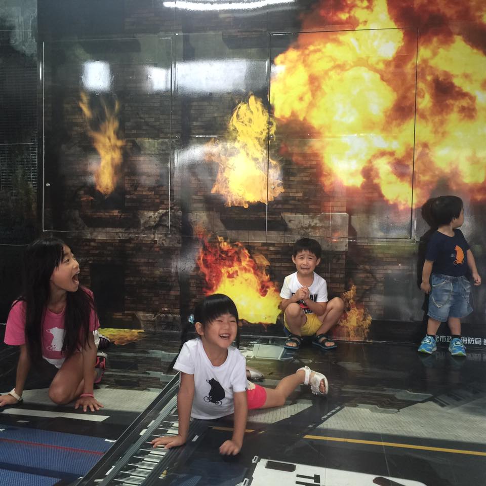 | 接著到了地震模擬區,大家戴上保護頭部的頭套,聽說台北市的學校都有做,戴好之後,地震就開始了!一陣劇烈搖晃,大家都躲到桌子下面,很有臨場感! |