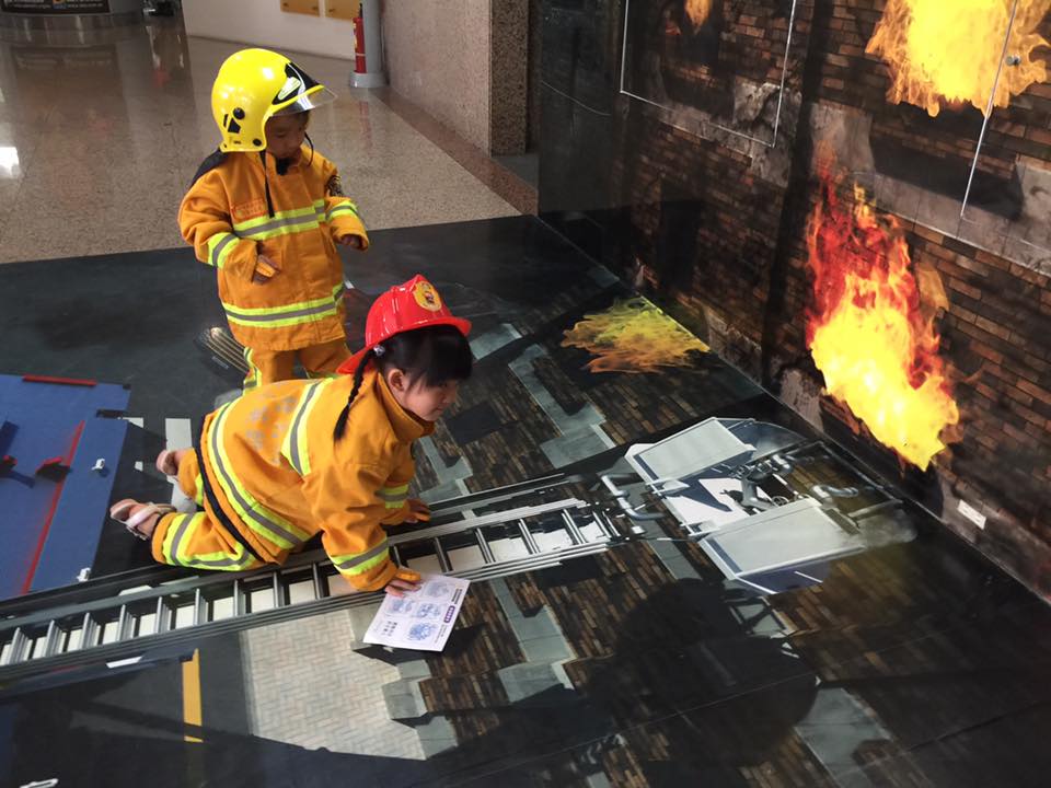 | 螢幕上會出現火的影片,大家要對準噴水,口令是『拉-拉-壓』,先拉保險,再拉出噴嘴,接著壓下去 |