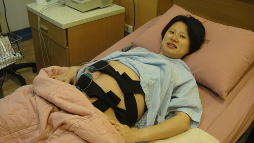 | 床上的兩條黑色彈性帶子要隨時綁在大肚子上測量胎心音與子宮收縮,只有上廁所時才需要拿掉,綁起來就像這樣子,先塗上涼涼的凝膠再放在肚子上。我頭的右上方床邊灰色的有call護士的按鈕,有任何問題都可以按鈕,會發出好聽的音樂聲,接著就會出現經驗豐富又和善的護士囉! |